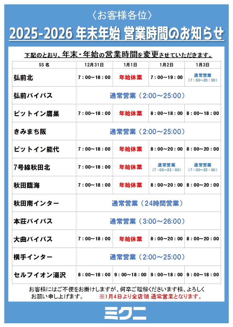年末年始 営業時間のお知らせ